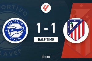 上半场比赛结束,马德里竞技客场暂时1-1战平阿拉维斯。