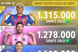 体育资讯11月28日讯 Score 90援引Euromericas Sport Marketing数据,统计了2025年截至目前世界足坛的球员球衣销量榜,亚马尔以131.5万件排名第一,梅西第二,C罗位列第七。