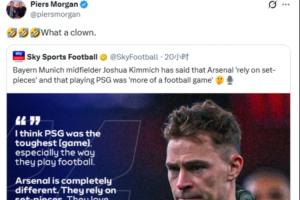 体育资讯11月28日讯 英国主持人、著名阿森纳球迷皮尔斯·摩根在社交媒体炮轰基米希,直言其是“小丑”。
