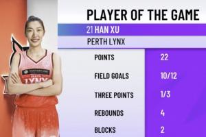 韩旭的WNBL首秀,登场29分钟,12投10中(三分3中1),罚球2中1,拿到并列全场最高的22分,外加4板1助2帽1断。