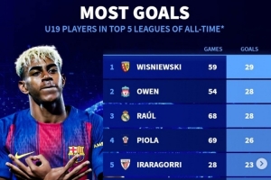 五大联赛历史U19进球榜: