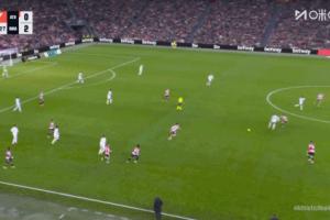 西甲第19轮,皇马3-0客胜毕尔巴鄂竞技。比赛第56分钟,姆巴佩在己方半场背身拿球被犯规,主裁吹哨,卡马文加在对方半场开球给到姆巴佩,这时主裁吹哨示意回到犯规地点开球。在死球状态下,姆巴佩穿裆戏耍了扑过来的毕巴后卫博伊罗,博伊罗愤怒推翻了姆巴佩,主裁赶过来将姆巴佩教育了一番,姆巴佩双手指自己表示不解。